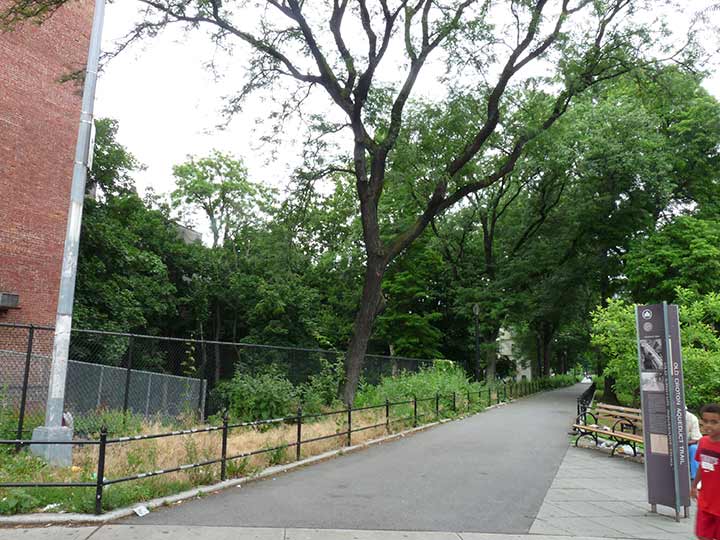 Many of the Old Croton Aqueduct’s New York City remnants are visible in the Bronx and even in upper Manhattan, as are some reminders of the New Croton Aqueduct, built in 1890 to replace the older. Aqueduct Walk was constructed in the late 1930s and opened in 1940 on an embankment over the Old Croton Aqueduct from University Avenue just north of West Tremont Avenue north to West Kingsbridge Road just south of what was the Jerome Park Reservoir.