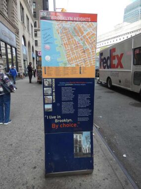 Before heading east on Bergen Street I first had to walk a bit on Court, so I decided to check on the demolition of my old school on Remsen (on this walk I visited two of my old schools). The subway took me to Court and Joralemon where I found one of these helpful maps of the area; these have been placed in selected neighborhoods round town and I wish each neighborhood could get one. Vandalism is likely in many areas around town, which probably keeps the city from spending too heavily on them. The maps contain nearby architectural and historical highlights.