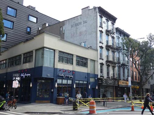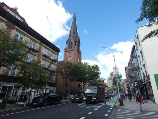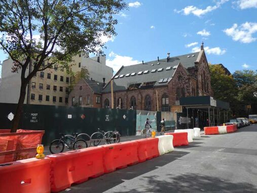 A temporary view of the eastern wall of 99 Clinton, a former Gothic church at the corner of Clinton and Remsen and adjacent to SFC has opened up until the new Remsen Street buildings are completed with an estimated 2029 opening date. The building features pricey, albeit dark, apartments that sell for millions. It started out in the mid-1800s as the First Presbyterian Church, later (1882) the Second Presbyterian and then Spencer Memorial. The church disbanded in 1994 and the building was converted to residences.