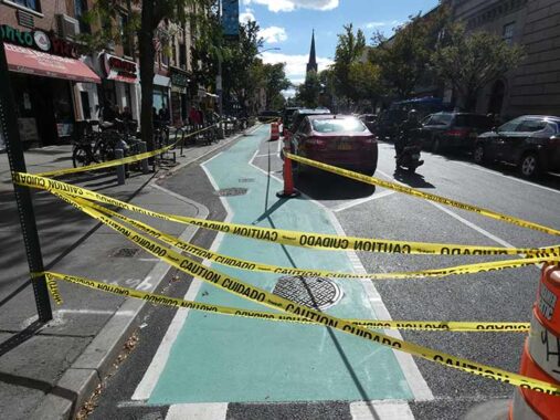 Beginning at Atlantic Avenue, Court Street has been reduced from two southbound traffic lanes to one, as its new bicycle lane opened soon after my visit.