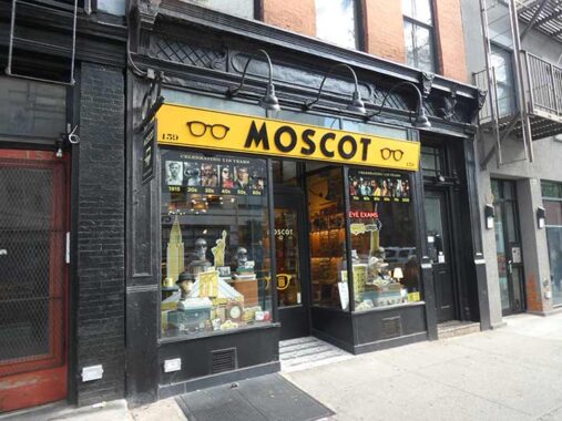 Sol Moscot, #159 Court, was founded on Rivington Street on the Lower East Side in 1915 after founder Hyman Moscot started selling eyeglasses from a pushcart in 1899. It now has several locations around town, all marked by distinctive yellow signage and lettering in what looks like the Kabel or Futura font (but isn’t either). I was hoping those gooseneck lamps were older, but they don’t show up on the 1940 tax photo.