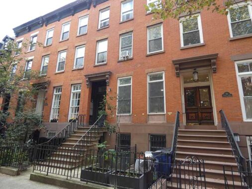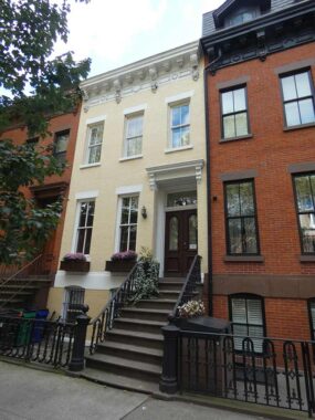 Amazingly nearly the entire block of Bergen Street between Hoyt and Bond Streets on its north and south side consists of simple three-story attached brick residences, built for working families, nay of whom worked on the waterfront. Today they sell in the millions. They were built in groups by different developers from the 1850s through the 1870s and exhibit subtleties in details.