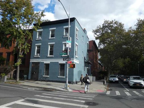 This brick, Greek Revival-style corner row house with alterations, originally built with a commercial ground story, was constructed in 1851 for Abraham Knox at a time when the neighborhood was being developed with row houses in response to transportation improvements in the area and the growth of industry along Gowanus Creek. Knox was a local landowner who, aside from developing his property, was in the business of making barrels and casks. The building displays features common to the Greek Revival style as found on modest, working-class row houses, such as a molded cornice above a plain brick fascia on the main facade and a dentil course below the rear roof gutter. The storefront has been converted to residential space. [LPC Report]