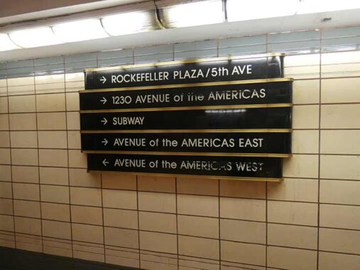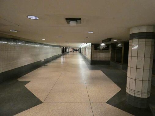 In December 2025 I took a quick walk in the Rockefeller Center pedestrian passage beneath 6th Avenue for six blocks between 47th and 53rd Streets, accessible in its south end at the IND 47th-50th Street station (B, D, F). It also has a corridor running east to 5th Avenue at St. Patrick’s Cathedral. Reddit has a map of the corridor. It’s lined with shops and eateries of various affordabilities. Last time I was down here, before the pandemic, there was plenty of public seating and I had a pizza place I would go and relax with a slice or two. That convenience now seems to have been eliminated, as a great deal of public seating has been. There is also a little known passageway south to 42nd Street.