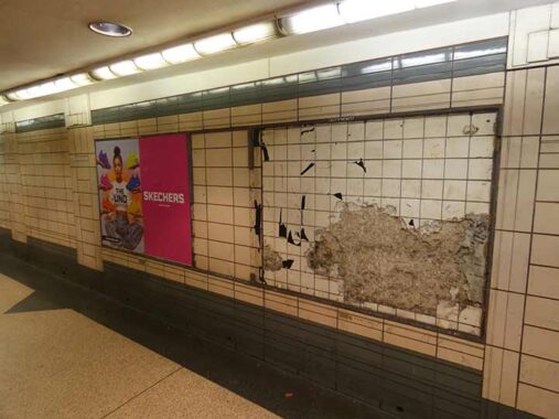 Though signage in the retail area has been updated to look more modern, the actual passageway area is something of a time capsule, combining 1930s tilework with 70s-era design. The signs are in the Avant-Garde font, used commonly in the 70s and 80s but somewhat dated now. One of the signs points to a “token booth.” The MTA has been through two different fare collection methods since tokens were phased out in the 1990s, Metrocards and the tap-and-ride OMNY system in which 8fares come from a tapped card or directly from your bank when you tap your phone.
