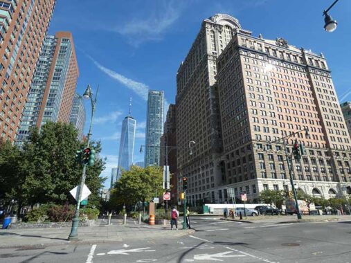 Standing now at Battery Place and Greenwich Street, with a view of One World Trade Center. On the right is an iconic lower Manhattan building, #17 Battery Place, constructed from 1902-1904 as the Whitehall Building (arch. Henry Hardenburgh). For years it hosted the Moran tugboat dispatcher, and a watchman in one of the upper floors would keep watch for incoming ships using a spyglass and used a megaphone to dispatch tugs to assist them. In the rear is the Greater Whitehall annex, completed in 1910. It was at one time the biggest office building in NYC. Both have been converted to residences.