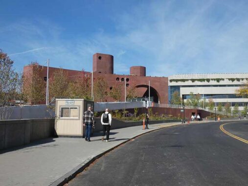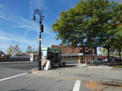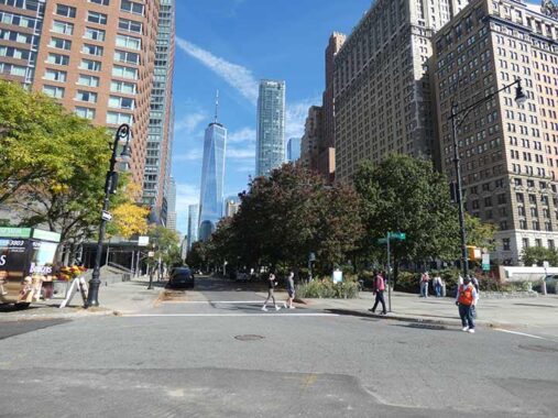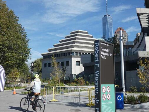 When Battery Park City was built, Battery Place was extended to take a northerly turn. Robert F. Wagner Jr. Park was opened in 1996 at the Hudson River edge from here north to Chambers Street at Stuyvesant High School. The park’s massive pavilion, containing event spaces, a restaurant and classrooms, was designed by Thomas Phifer. The park is named for the three-term mayor of NYC from 1954 to 1965.