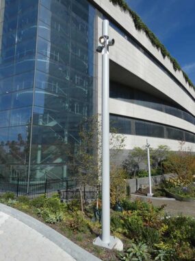In many of NYC’s newer parks, such as Wagner Park, minimalism is the trend for park lighting. This is a simple metal cylinder with lighting fixtures at the apex. Brooklyn Bridge Park employs tall, cylindrical wood telephone poles with floodlights. Classic Type B park lamps, though, are found elsewhere in Wagner Park.