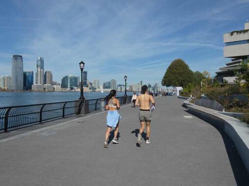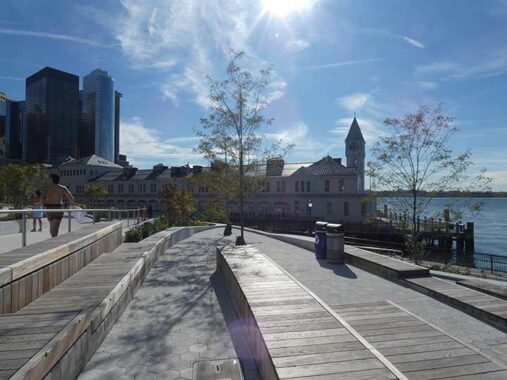 Along the waterfront at Wagner Park there are two man-made Hudson River inlets, South and North Cove. South Cove Park, opened in 1987, features two wooden boardwalks lit with lamps echoic of the Robert Moses parkways’ old “Woodie” lamps, but featuring blue glass. Also featured is a pergola and plantings that include beach grass, beach rose, bayberry and beach plum. The park’s design was by artist Mary Miss, landscape architect Susan Childs, and architect Stanton Eckstut. It is directly opposite Jersey City’s financial district, with its rather meh skyscrapers. The photo features the two tallest buildings in New Jersey, the Goldman Sachs Tower (30 Hudson Street) on the left and 99 Hudson Street, 79 stories and 900 feet in height, to its right; it took the title from 30 Hudson in 2019. Not to be outshone, New Jersey’s 4th tallest building, URBY Harborside Tower I, is off to the right.