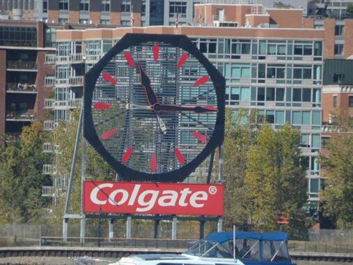 Overlooking the Hudson River, the octagonal Colgate clock and signage perched on a company structure remained unaltered until 1983. The signage “Soaps-Perfumes” was removed and a toothpaste tube, advertising one of Colgate’s best selling products, took its place. Two years later and after 141 years in Jersey City, Colgate decided to move out, citing the need for improved facilities that its original manufacturing complex could not provide. The entire complex was razed, and the clock, without the toothpaste tube, was lowered to ground level as a freestanding icon on the future Goldman Sachs property, where it stood for fifteen years. The 24-acre site became part of the redevelopment of the Jersey City waterfront at Exchange Place that began in the early 1990s.