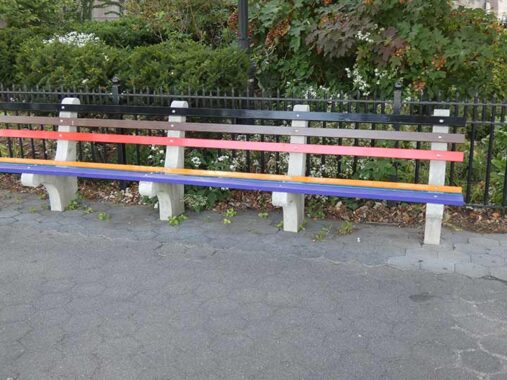 This is the standard design for NYC park benches (though there are other designs). The rainbow colors may be left over from June gay pride observations.