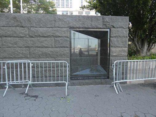 Close by the Yaya Hough artwork sits the NYPD Memorial Wall located within yards of the World Trade Center, founded in 1997, which has the names of over 500 members of the NYPD killed in the line of duty. Many were added after 9/11/01.