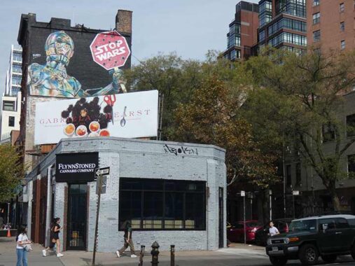 At Christopher Street’s west end at West Street is a mural depicting the Star Wars “robot”droid” character C-3PO holding a “Stop Wars” sign, an early effort by the talented Brazilian muralist Kobra.