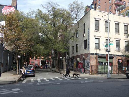 At Christopher Street, Bleecker widens briefly and turns gently east-southeast, beginning a general eastward turn that will actually point east-northeast by the time the street reaches The Bowery. According to the Manual of the Corporation of the City of New York, the widening was done in 1827 when Bleecker was still called Herring Street, necessitating the removal of three houses, and apparently was done as part of the straightening of Grove Street, one block south of Christopher (which was a road to the river as far back as colonial days when it was called the Skinner Road, for Colonel William Skinner, whose father-in-law, Peter Warren, owned much of Greenwich Village in the colonial era).