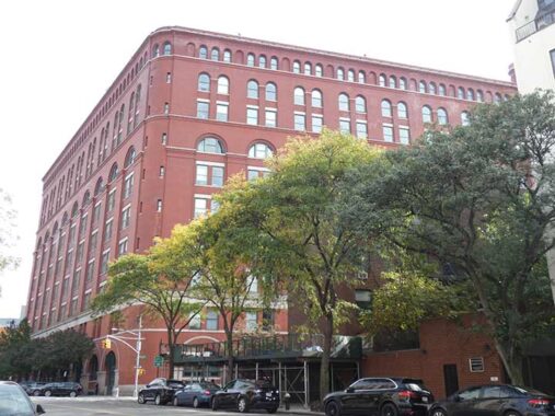 They don’t build them like this anymore, at least for utilitarian warehouses. The huge brick building with unending arches on the ground floor, named The Archives, occupies the entire block defined by Christopher, Greenwich, Washington and Barrow Streets — one of the few buildings in New York City to do so. It was constructed from 1892-1899 as a warehouse for goods awaiting inspection by US Customs. Later it became U.S. Federal Archives Building; it is currently home to condominiums, but there’s a supermarket, gym and dry cleaners on the ground floor as well as a theater in the interior. The bottom two floors were designed by Supervising Architect of the Treasury Willoughby J. Edbrooke, and they don’t have names like that anymore, either.