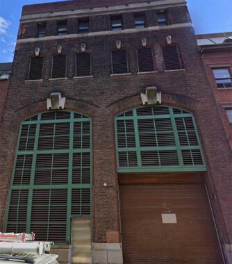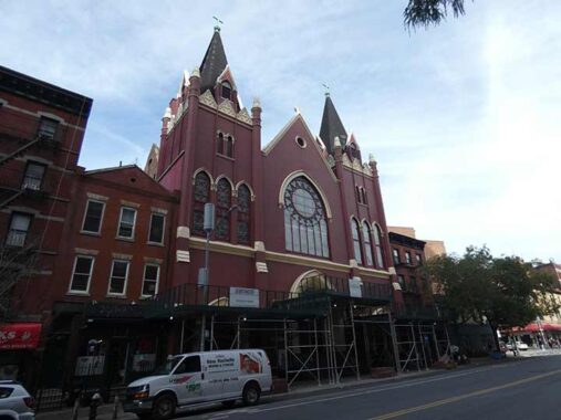 The blocky, red-bricked, twin-peaked former St. Veronica’s Church, #149-153 Christopher, was completed in 1903, after thirteen years of construction. The parish had been in existence since 1887, founded to serve Irish dockworkers along the Hudson. The site had, decades earlier, been occupied by Newgate State Prison.