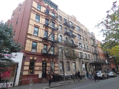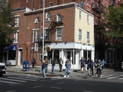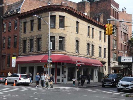 Christopher Street is within the Greenwich Village Historic District Extension between Washington and Greenwich Streets; east of that, it’s in the GVHS proper, one of the oldest designated landmarked districts in the city. The corner building, #159-163 Christopher, went up in 1880 and for decades was owned by the Ferrara family of confectioners. The ground fllor hosts the Malatesta Trattoria, with its interesting hand painted sign. Interestingly, “mala testa” is “bad head” in Italian.