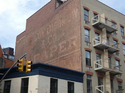 The former Coy-Disbrow Paper Company ad has faded, but not illegibly. Actually this ad is younger than some of the other ones of its type. The company moved to this building on Greenwich between Christopher and West 10th in 1930; the wholesale company had been founded by Robert Henry Coy (1877-1942) and Hamilton Thomas Disbrow (1852-1942) in 1922 on Canal Street. Disbrow was called “dean of commuters” of the Delaware, Lackawanna & Western Railroad after traveling to the city from New Jersey every day for over 70 years.