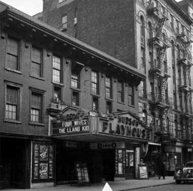 No. 121 Christopher was originally two 1868 Federal row houses that were converted into a moving picture house in 1913 and a theater sometime thereafter. In 1940, #121 was the Hudson Playhouse and was playing “Four Wives” featuring the Lane Sisters, Claude Rains and Eddie Albert, and “The Llano Kid,” a Western with Tito Guízar, from a story by O. Henry.