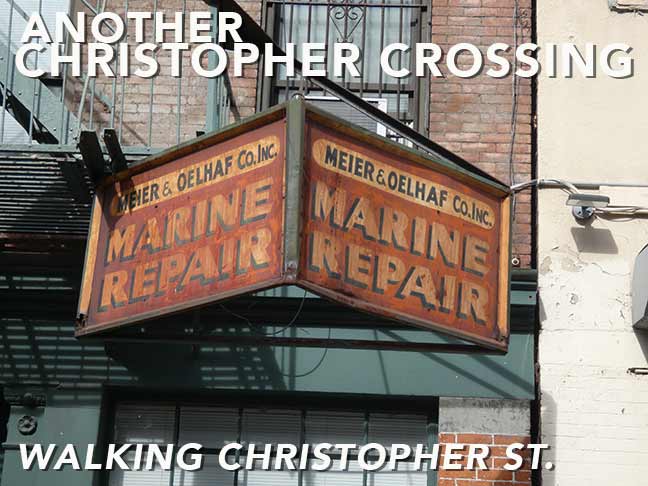 #177 Christopher (also a red entrance!) is also included in the landmarked district. It was built in 1883 and in ints early years housed four different marine repair firms, the last of which was Meier and Oelhaf, whose metal painted sign, mounted below a fire escape, has been preserved by subsequent owners over the years.