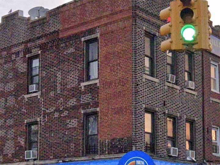 WHILE trolling Google Street View (I do it to pass the hours between waking and sleeping) I found this interesting item on the corner of Hillside Avenue and 143rd Street in Jamaica, and ancient ad that was composed unusually on the 143rd Street side. There are some words spelled out in bricks that jut out more than the surrounding brickwork, an interesting way of placing wording. I looked at it from numerous angles and couldn’t get a decent fix on what it said.