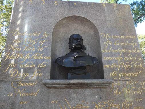 John Wolfe Ambrose monument at Battery Park honors the engineer who planned the channel carrying his name that eased navigation through Lower New York Bay.