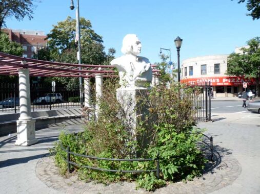D’Auria-Murphy Triangle in the Belmont neighborhood honors two local World War One casualties, John D’Auria and Henry J. Murphy. The streets bordering the park include Crescent Avenue, Adams Place, East 183rd Street, and Arthur Avenue. As this is a historically Italian neighborhood, this park has a bust of Columbus by Attilio Piccirilli installed in 1926.