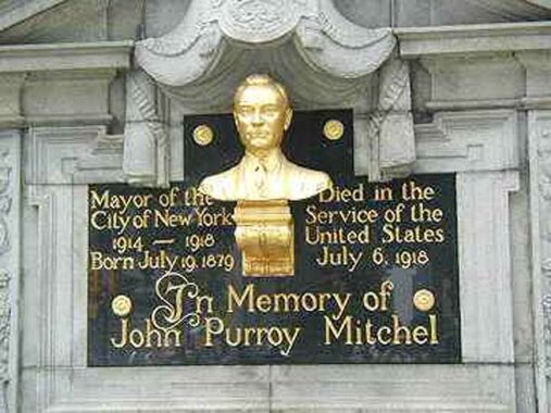 Mitchel Square, West 166th Street, Broadway, and Audubon Avenue, in Washington Heights honors John Purroy Mitchel, the youngest mayor of this city, who was killed in a training flight during World War One. NYCHA Mitchel Houses in the Bronx also honor this lawmaker. There is also a monument for Mitchel in Central Park (left), and a memorial flagpole in Bryant Park.