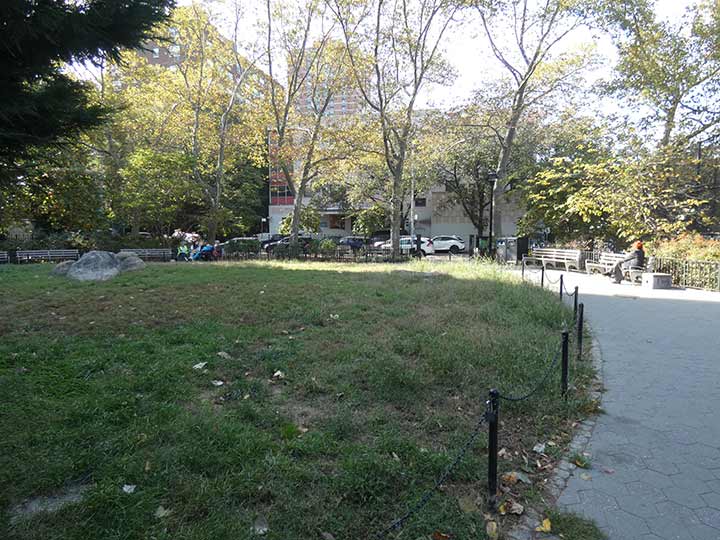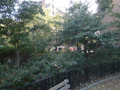 Another park attraction: if you look carefully through the trees, you can see the rusting but landmarked “Sheriff Bishop Crook” that marks the former corner of Broome and Sheriff Streets.