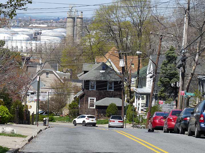 In this photo we see the contrast between tranquil, residential Randall Manor (the western end of New Brighton) in the foreground and the east end of Bayonne, NJ in the background, which is completely given over to manufacturing and warehousing. We see the white containers of Gordon Terminal Services and 200-foot tall silos manufactured by Atlantic Cement in the Bayonne Cement Terminal, owned by Lafarge North America. I’ve been to Bayonne a few times, but obviously not this section which is closed to the public.