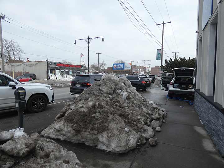 I decided to walk on the Nassau County side of Jericho Turnpike, which may have been a mistake since Nassau County is even less dedicated to clearing crosswalks than the Department of Transportation in NYC is, and I was truly risking injury slipping on ice and half-melted ice. The ice pile you see was put down on January 25, a good three weeks prior, but it had been stone cold since, rarely getting above 25 degrees and hence all the snow that fell stayed in place, pushed b y straining plows into what you see here. Another two feet fell eight days after this photo was taken. Feb. 14 was rather mild, though, and I pocketed my scarf after while.