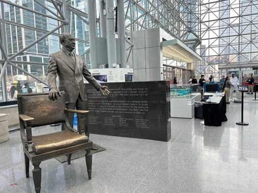 As visitors rush to see things like the international auto show, the boat show, and comic con, among other things, they may miss the monument to its namesake. That’s why there’s Forgotten-NY, for the overlooked details in otherwise highly visible places. William Crozier’s bronze likeness of Sen. Jacob K. Javits offers a seat to the public, next to a wall of names listing his family members and supporters. He was a liberal Republican in the example of Fiorello LaGuardia, serving as the state Attorney General, Congressman, and then Senator. His name also appears on a playground in Washington Heights and the federal office building at Foley Square.