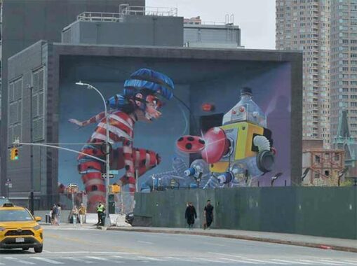 Across 11th Avenue from Javits Center at W. 36th Street is another mural from this series, Sustainable Plastics by Super A, the pseudonym of Dutch artist Stefan Thelen. The nondescript building hosting this artwork is a ventilation shaft for the super deep 34th Street-Hudson Yards station on the 7 train. Kevin walked past this mural last year in his review of Tenth Avenue in Chelsea.