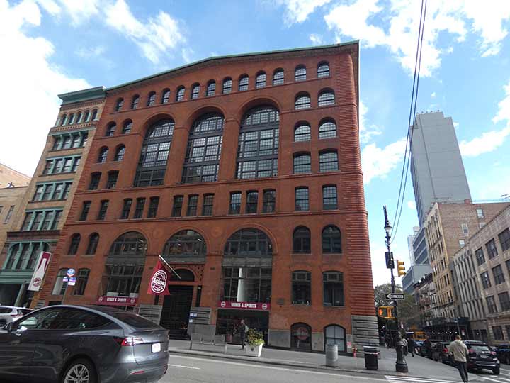 HERE’S the DeVinne Press Building, 393-399 Lafayette on the NE corner of East 4th. When researching the building, from my Photo-Lettering type days I remembered the Bodoni-esque DeVinne type font. Theodore DeVinne was a giant of print on either side of 1900, publishing then-popular but now forgotten magazines such as Scribner’s, Century, and St. Nicholas Children’s Magazine. The DeVinne name was famed for innovative type fonts and high-quality books and magazines. The press building was constructed in 1886 with additions in 1890, by the architects Babb, Cook and Willard.