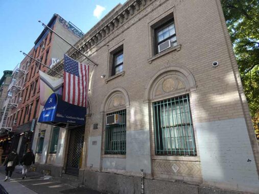 The Judson Health Center, providing care for neighborhood residents, is affiliated with Judson Memorial Church on Washington Square South. It was founded in 1921 and moved into this handsome brick building on #34 Spring, east of Mulberry, in 1950, and keeps its signage inconspicuous. The building was originally the New York Dispensary, built in 1912, a medical clinic that fulfilled the same purpose as the Northern Dispensary in Greenwich Village, and more or less what the Judson does today.