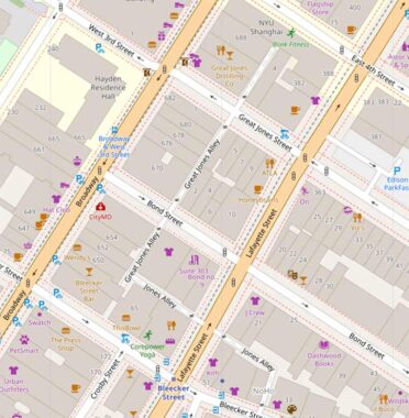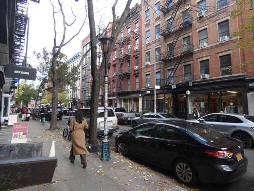 The north end of Elizabeth Street is on Bleecker. I zagged west on Bleecker and zigged up Lafayette to Cooper Square, but I’ll deal with that on another post. When I am here, I always check on a fenced-off alley known as Jones Alley, Great Jones Alley and Shinbone Alley; maps differ on what is which, and the city no longer installs street signs as the alley has been privatized. It runs from north of Great Jones south beyond Bond, then turns east past Lafayette, and then south to Bleecker. The stretch north of Bleecker is still Belgian-blocked.