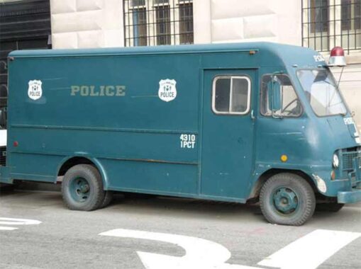 100 Old Slip at South Street, the former location of NYC Police Museum, a replica of an Italian Renaissance palazzo, was constructed from 1909-1911 by the firm Hunt and Hunt as the 1st Precinct, replacing an earlier building on the site constructed in 1884. After the precinct moved out in 1973, the building served as the Landmarks Preservation Commission offices from 1993-2001, and was then dedicated as the Police Museum, which occupied the space between 2002 and 2012. In the latter year I found a 1960s-era “paddy wagon” parked outside.