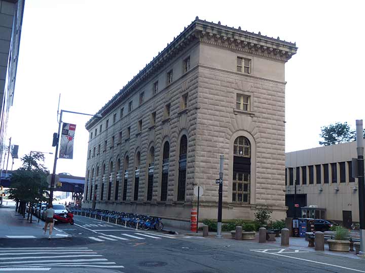 100 Old Slip at South Street, the former location of NYC Police Museum, a replica of an Italian Renaissance palazzo, was constructed from 1909-1911 by the firm Hunt and Hunt as the 1st Precinct, replacing an earlier building on the site constructed in 1884. After the precinct moved out in 1973, the building served as the Landmarks Preservation Commission offices from 1993-2001, and was then dedicated as the Police Museum, which occupied the space between 2002 and 2012. In the latter year I found a 1960s-era “paddy wagon” parked outside.