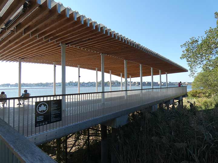 A second Almer Pavilion was built in 2002, but a decade later, Hurricane Sandy made quick work of it after similar deterioration and it was subsequently demolished. This, the third Almer Russell Pavilion, was opened in the late 2010s. It’s a beautiful spot to view the water, but like many of the newer public works, it was built without seats to deter lingerers and camera toting skulkers, like me.